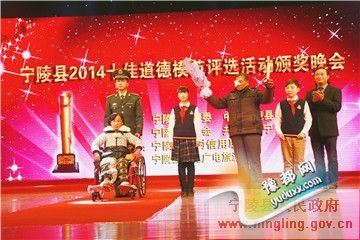 会场流光溢彩,气氛庄重热烈。晚会通过播放模范先进事迹电视短片、现场访谈、歌曲等形式,生动展现了道德模范的感人事迹和崇高品德。颁奖晚会上,一个个以实际行动践行社会主义核心价值观的道德模范,用他们平凡的话语和感人的事迹深深打动着现场观众的心。他们中间有用母爱琼浆酿造重组家庭甘甜的孝老爱亲郑文梅;用慈爱唤醒植物人丈夫的好妻子顾丽英;双手任辛劳巧扮宁陵城的城市美容师丁二兰;用坚辛点亮万家灯火的光明使者孙志勇;腰弯90度坚守三尺讲台的最美教师张伟;12年用弱小身躯扛起一个家的最美女儿王香浦;捐献骨髓挽救素不相识女孩生命的仁医窦修丽;七年无私收养流浪智障老人的好心人白智超;跳入刺骨河水勇救落水夫妇的大学生村官乔家磊;拾荒10年供养病残育婴的耄耋老人程兴友。各位道德模范平凡而感人的事迹给了所有观众一次难得的心灵洗礼,掌声一次又一次在现场响起,表达着对全县道德模范的崇尚和景仰。