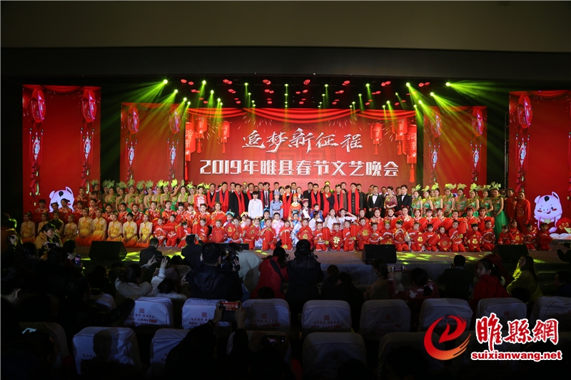 舞蹈《庆新年》拉开了整场晚会的序幕,流光溢彩的灯光,红红的灯笼,喜庆热闹、激扬优美的音乐,红红火火轻快活泼的少儿舞蹈,把中国新春佳节的亮点和节日传统文化元素,完美的呈现在舞台上。歌曲联唱《在希望的田野上》、《我的中国心》、《春天的故事》、《走进新时代》,在睢县这片充满希望的田野上,全县人民走进新时代,一幅幅建设家乡的壮丽画卷。2018年睢县县委县政府带领全县上下凝心聚力,攻坚克难,坚持把脱贫攻坚作为最大的政治任务,最大的民生工程,围绕两不愁三保障,开展精细精确精微的绣花式扶贫。在这个过程中发生了许许多多的动人故事,节目《关爱》、《我们的誓言》、《精忠报国》用节目再现了全县广大帮扶驻村干部风雨兼程,义无反顾奔赴精准扶贫一线冲在最前方,干在最实处,换来群众幸福指数的提升。《中华孝道》、《中国之礼》,让观众领略睢州大地刮起的一股孝善风。诗歌朗诵《锦绣襄邑》、歌曲《我爱你中国》、舞蹈《不忘初心跟党走》、舞蹈走秀《共和国走向未来》、少儿舞蹈《村娃过年》以及《我们的誓言》等一个个精彩节目轮番上演,掀起了晚会阵阵高潮,赢得现场观众热烈的掌声和喝彩声,台上台下一片欢声笑语,处处洋溢着节日的喜庆气氛。晚会以多种多样的节目形式和丰富的艺术形态、艺术元素表现了睢县近年来,在经济稳定,社会稳定中取得一系列骄人成绩。