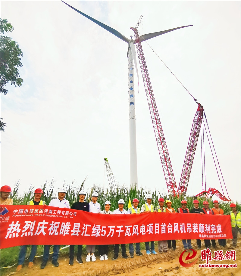 2020年8月14日上午8时,随着轮毂和叶片缓缓吊装就位,睢县汇绿新能源有限公司5万千瓦集中式风电项目顺利完成首台机组吊装,140米的轮毂高度创造了水电顾问公司的新记录。同时,这个矗立在豫东平原上,有着208米高度(含叶片长度68米)的“风中巨人”,也成为了睢县的新地标。