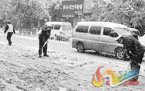 11月24日,夏邑县交警在清理积雪。县交警队出动100余名队员,在县府路、孔祖大道、东光路、康复路、昌盛路等主要街道清除积雪,为城镇居民和学生打通道路。