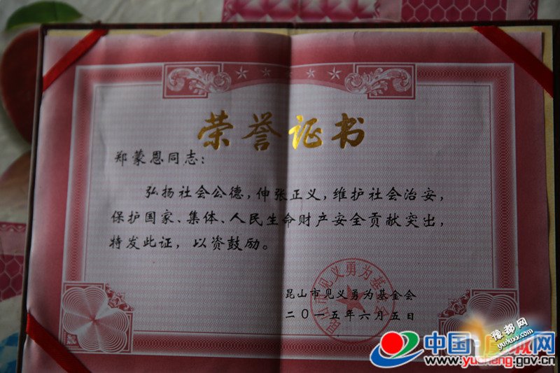 今年3月15日,家住刘店乡门神楼村的郑蒙恩,在昆山务工期间,在劝阻一起斗殴事件中,被歹徒殴打、捅刀致死。6月5日,郑蒙恩的行为被昆山市见义勇为基金会认定为见义勇为。近日,昆山市对郑蒙恩见义勇为的行为进行了表彰。见义勇为、匡扶正义、惩恶扬善是中华民族的传统美德,面对歹徒的恶行,郑蒙恩不顾个人安危,挺身而出,其行为可敬、可赞。