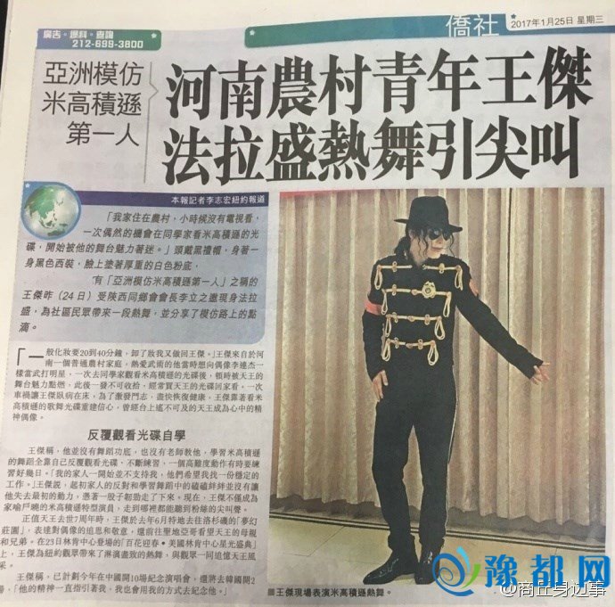 【商丘农村青年赴美演出引轰动 境外媒体专题报道】被誉为“全球迈克尔杰克逊第一专业模仿者”、美国好莱坞签约特型演员、也是全球关注度最高的模仿艺人王杰克逊受邀于1月24日到美国法拉盛演出,来自河南商丘的青年@王杰杰克逊 一出场就惊呆了全场观众,一段酷似“迈克尔杰克逊复活”的热舞表演立即引发全城强烈关注,并迅速成为热门事件,同时得到各大媒体的争相报道。