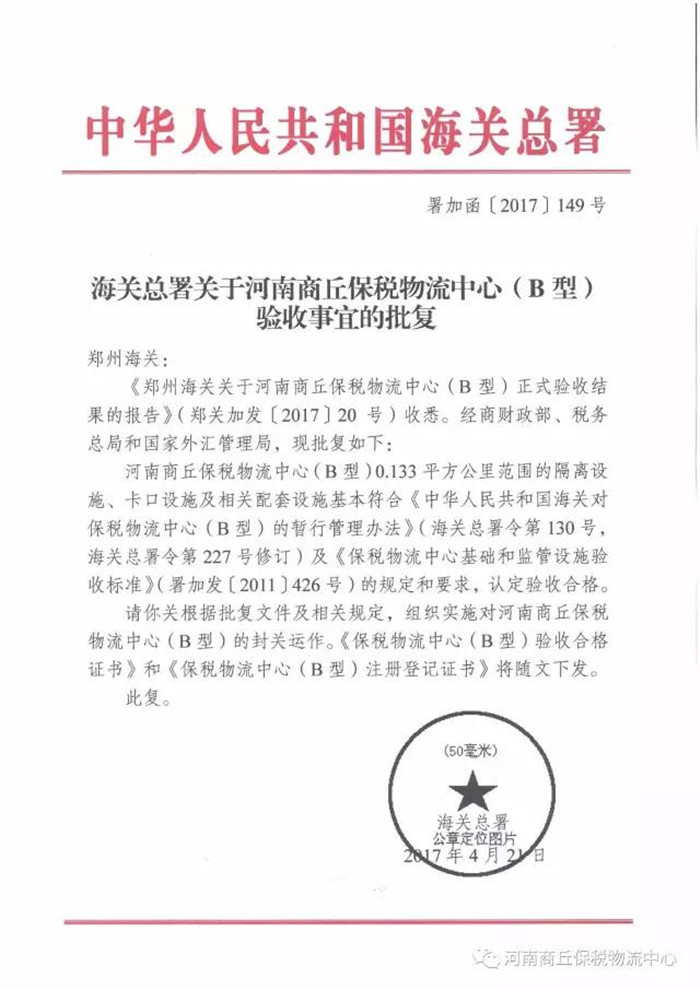 虞城网讯 海关总署关于河南商丘保税物流中心(B型)验收事宜的批复结果,于2017年4月21日认定验收合格。