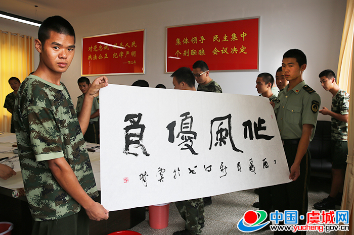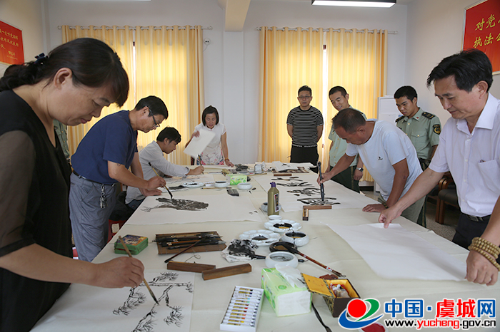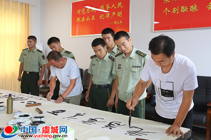 虞城网讯 7月30日,为庆祝“八一”建军节,我县书法协会、美术协会的十余名书画家走进消防大队,挥毫泼墨,创作了30多幅作品,受到了消防官兵的热烈欢迎。